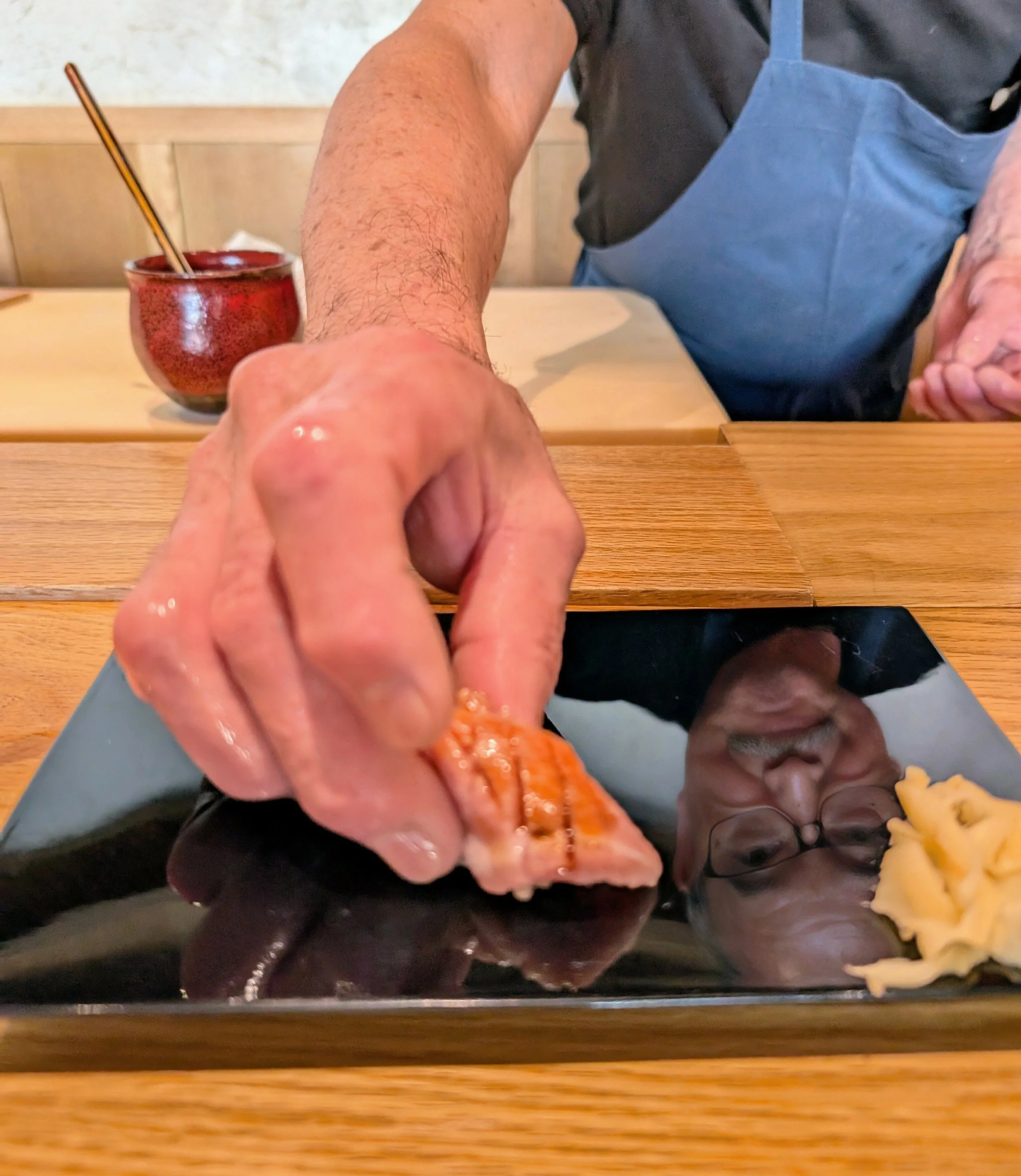 The sushi itself hasn’t gone anywhere. A line of nigiri came out, each one a study in minimal perfection: scallop capped with caviar, a hand roll of Hokkaido uni that was gone too quickly.
