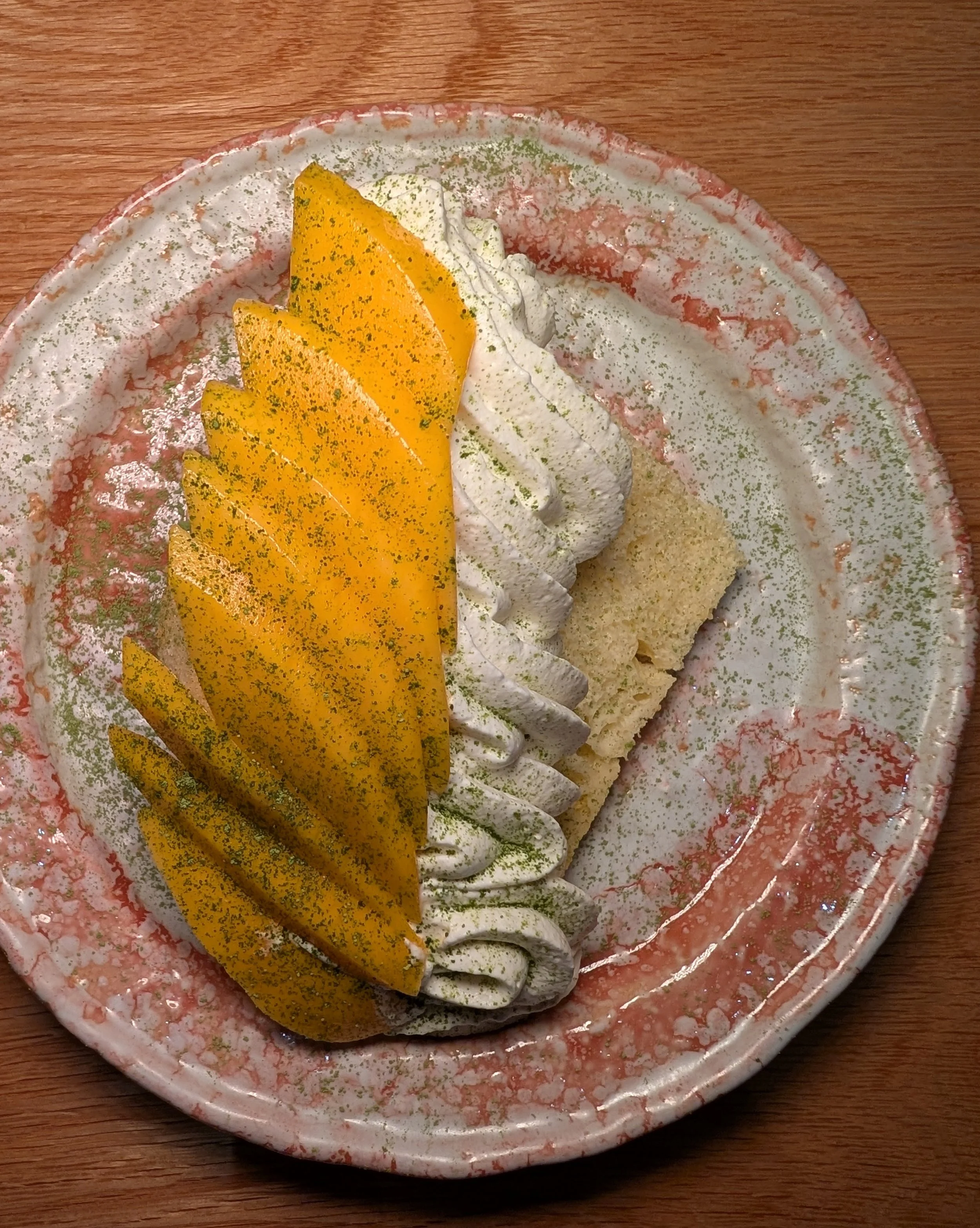 Dessert kept with that same balance of fun and precision. A Japanese spongecake topped with whipped cream, mango, and a dusting of matcha looked almost comically simple but ate like nostalgia.