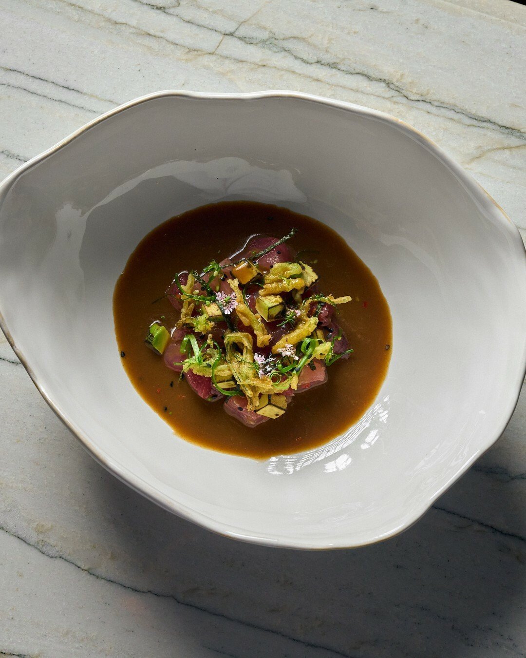 En lugar de clichés de sushi o atajos panasiáticos, el menú de Pesaque se lee como una carta de amor al oficio: ceviche de corvina con leche de tigre, un saltado que une carne de res y langosta, y hasta un rollo de atún con salsa acevichada y un toque crujiente. Es su trabajo más personal hasta ahora—“un viaje sensorial”, como él lo llama—y profundamente enraizado en esta ciudad.