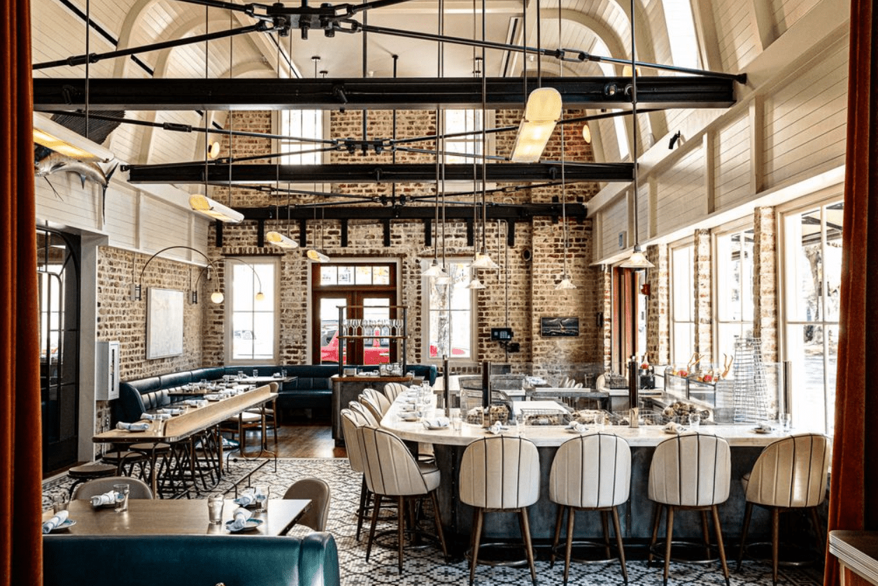 The Savannah outpost sits in a 130-year-old building at the corner of Montgomery and Bay, with big windows behind the oyster bar that look out over Franklin Square’s live oaks and a dining room that feels like it has stories. There is leather and dark wood and brick with the whitewash half-stripped away, heavy curtains and the kind of woodwork that looks taken off an old sailing ship. It is the rare “designed” restaurant that does not feel staged. I especially liked the striped bar chairs at the raw bar, which are comfortable enough that you start negotiating with yourself about a second round—and maybe another later.