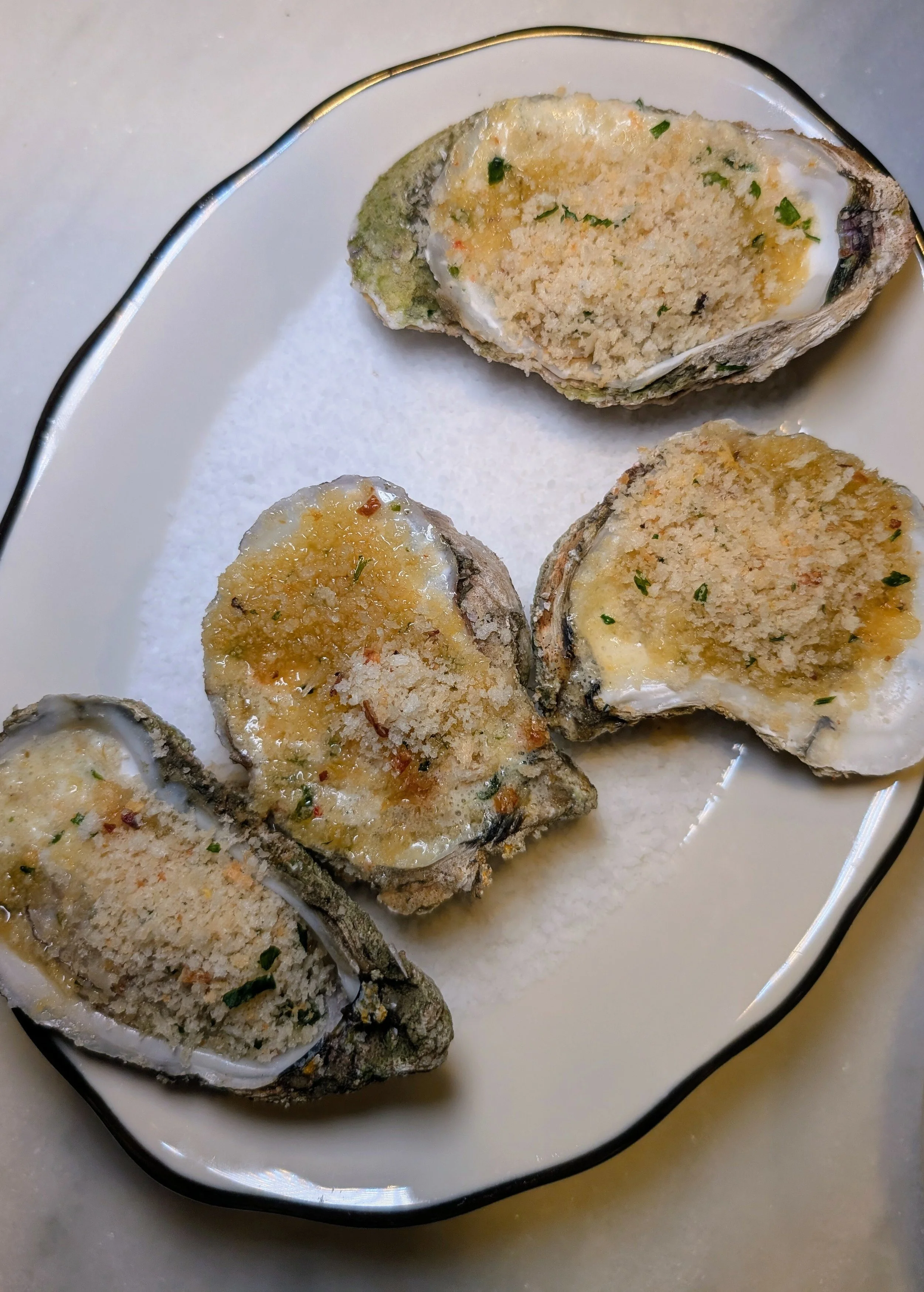 We started with roasted oysters in maître d’ butter and breadcrumbs, which is exactly the sort of dish you want to eat while watching someone shuck bivalves eight inches from your nose. The topping brought just enough crunch to stand up to the butter, which arrived bubbling and just shy of scorching. You can get them a couple other ways—Alabama white sauce with bacon or a pimento-cheese situation with sourdough soppers—which all sound like the answers to different nights.