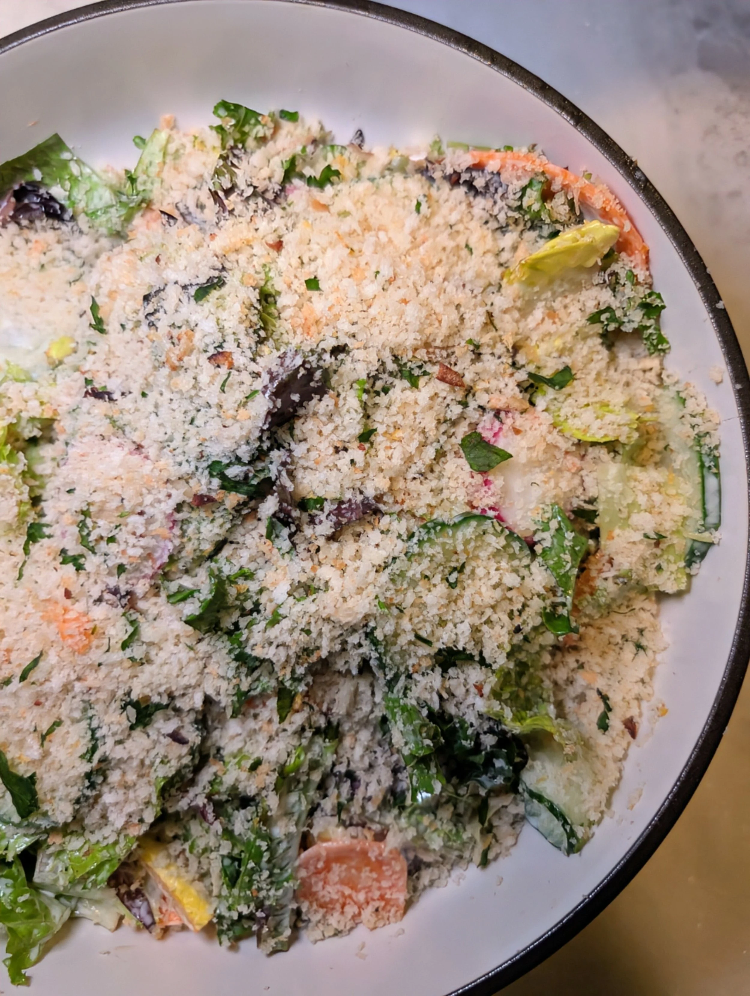 The green salad reads like a token gesture on the menu and then arrives looking lovely: a small mountain of sliced carrots and cucumbers and assorted veg, all under a confetti of crisp breadcrumbs. Just perfectly dressed, it was the light starter we needed before diving deeper into a heavy menu, which is what you want from a salad in a place like this.