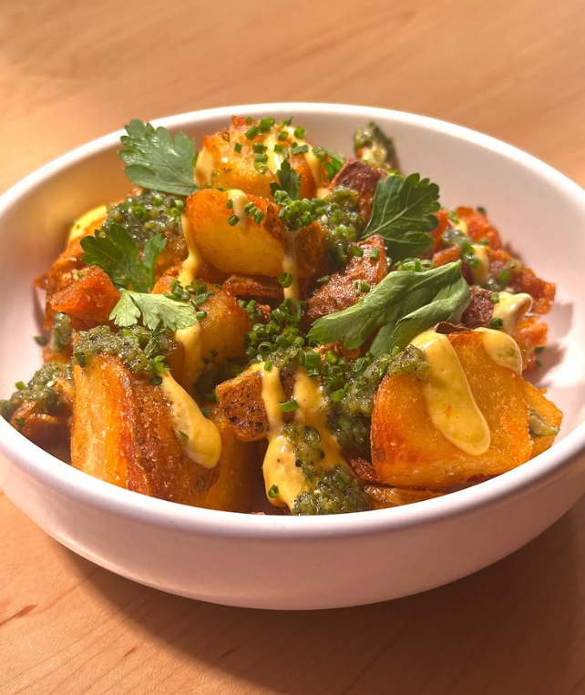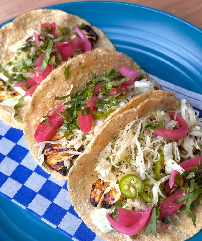 But even with that close attention to a single ingredient, there’s no attempt at precious minimalism. The space feels lived in—handmade plates, records stacked near the stereo, and an open kitchen glowing like a stage. It’s hard not to order too much: lechoncito tacos, rich with confit pork and folded into tortillas slicked with pork fat; rajas enchiladas drenched in a Cheerwine mole so perfectly North Carolina; and a pile of buñuelos, golden and cheesy.